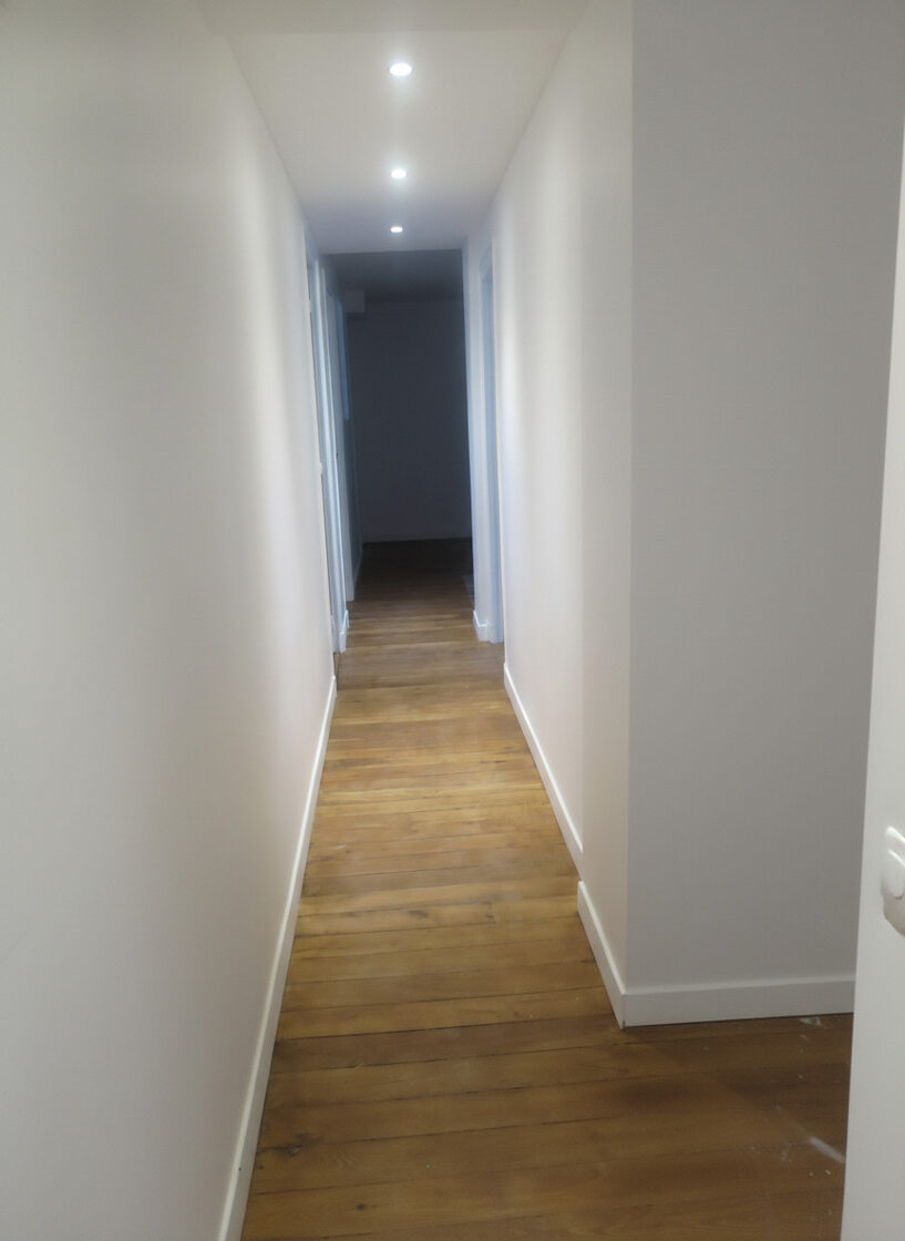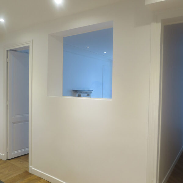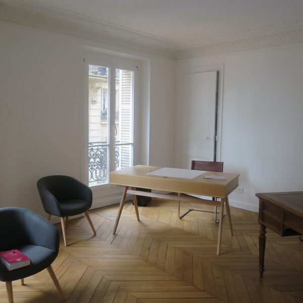 Cet appartement de 110m², situé au 1er étage d'un immeuble haussmanien dans le coeur de Paris, devait être totalement rénové et réorganisé pour pouvoir accueillir un cabinet d'avocats. Les pièces ont été redistribuées, de telle sorte à optimiser l'espace pour intégrer un accueil de la clientèle et une circulation dans l'appartement qui assure une confidentialité des rendez-vous professionnels. Le salon-séjour a été séparé en deux bureaux, chacun disposant d'une entrée distincte. Les huisseries ont toutes été remplacées par des fenêtres en double vitrage, pour améliorer l'insonorisation et l'isolation thermique. Les parquets en bois ont été conservés et rénovés. De faux plafonds avec un système d'éclairage intégré ont été installés dans les couloirs, ainsi que dans la cuisine. Les sanitaires ont également été entièrement refaits. L'ensemble des murs et plafonds ont été rénovés et repeints.