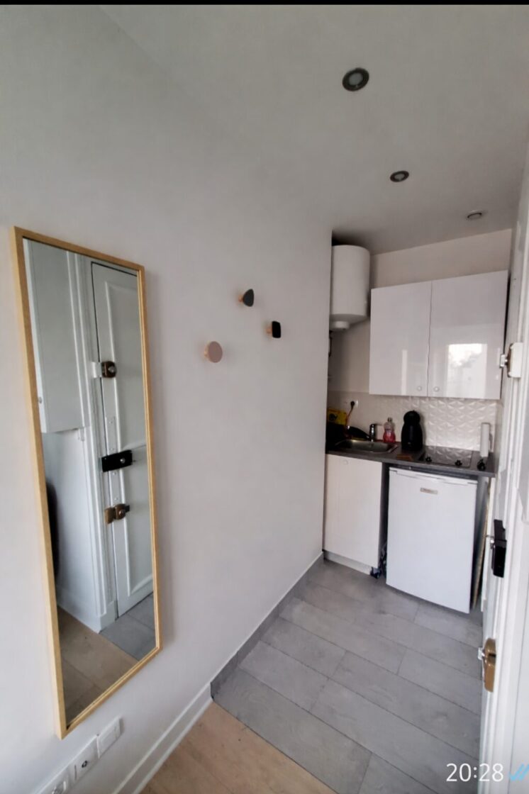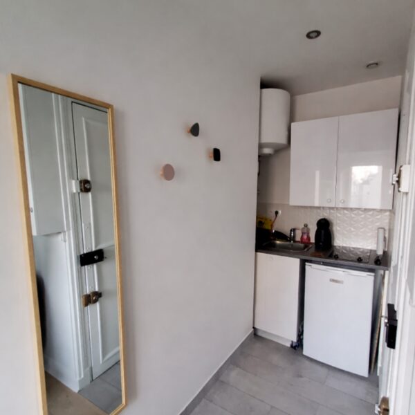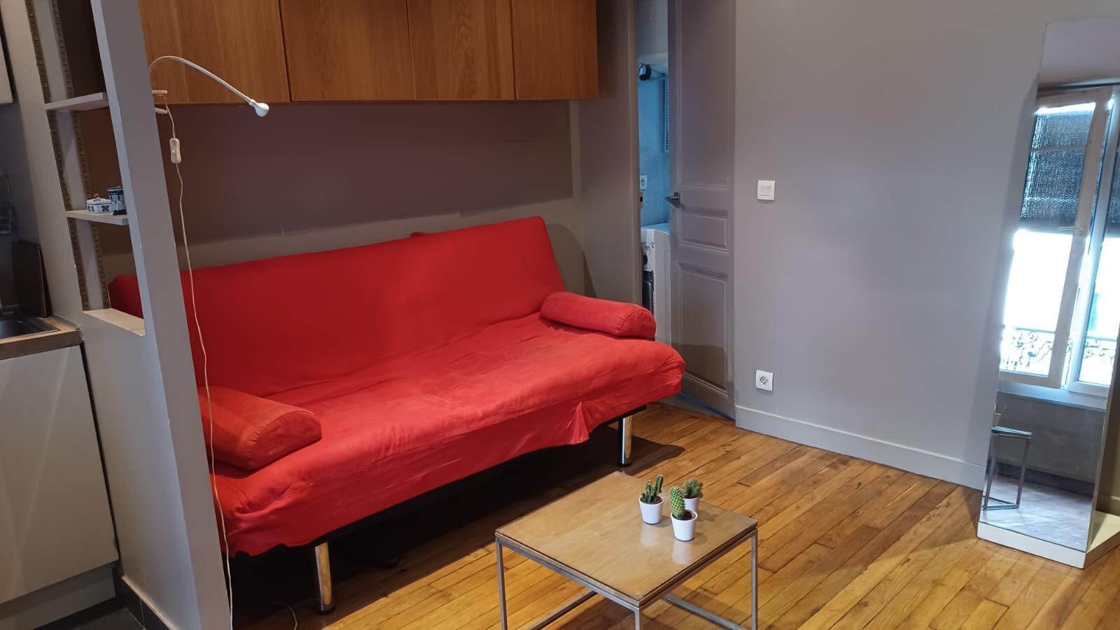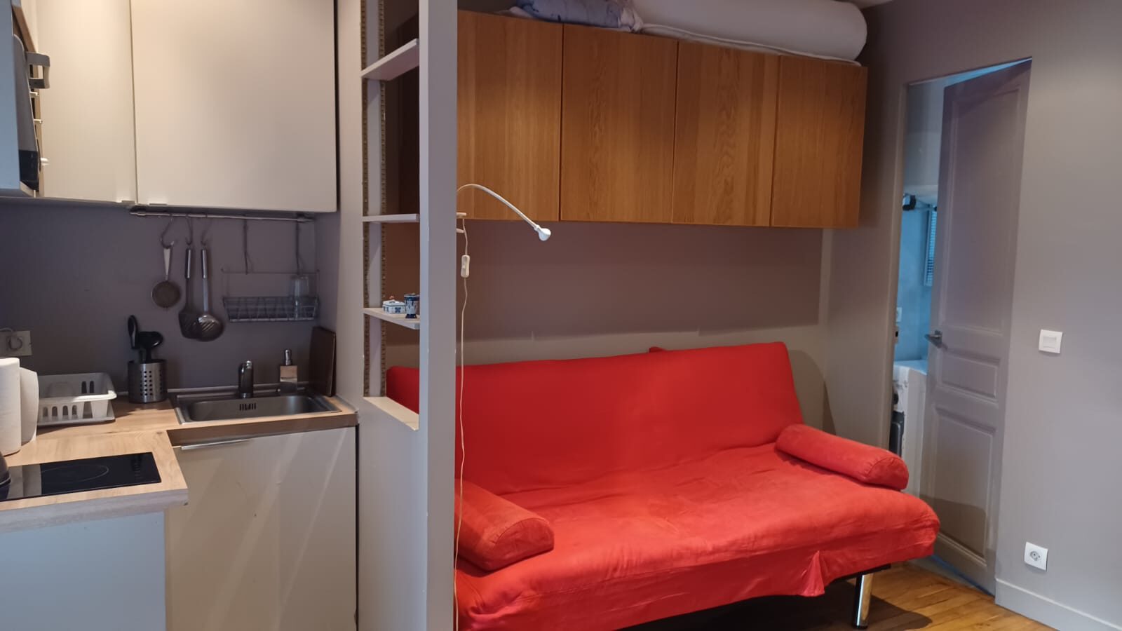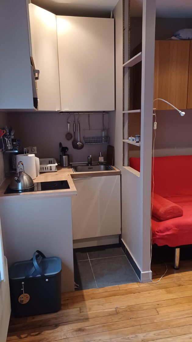 Ce studio de 17m² est situé au 4e étage d'un immeuble des années 1920 au nord de la butte Montmartre. Les priopriétaires souhaitaient optimiser l'espace en vue de mettre le bien en location meublée pour des étudiants ou des jeunes professionnels. Une cuisine entièrement équipée a été créée et séparée du reste de la pièce principale, par une cloison légère qui laisse passer la lumière. Le parquet a été réparé, poncé et vitrifié. Les plafonds et murs ont été repeints. Pour les murs, le choix s'est porté sur un beige clair pour conserver au studio sa luminosité. La rénovation de la salle de bains a constitué un défi. Dans cet espace de 3m2, il a fallu créer une douche, installer des wc, un lavabo, ainsi qu'une lave-linge/sèche linge.
