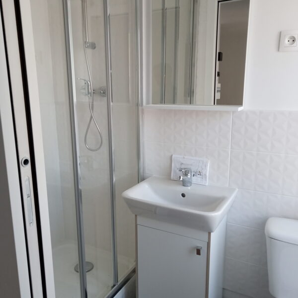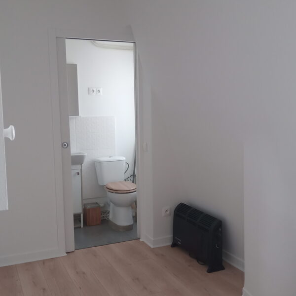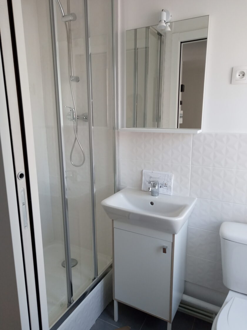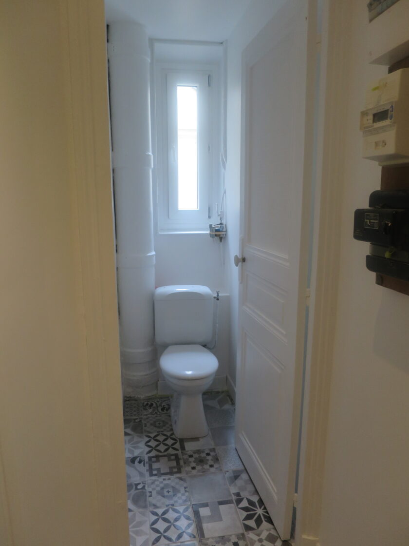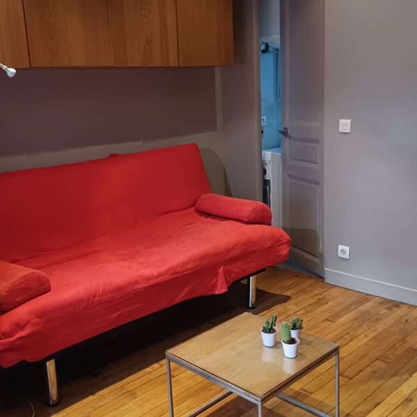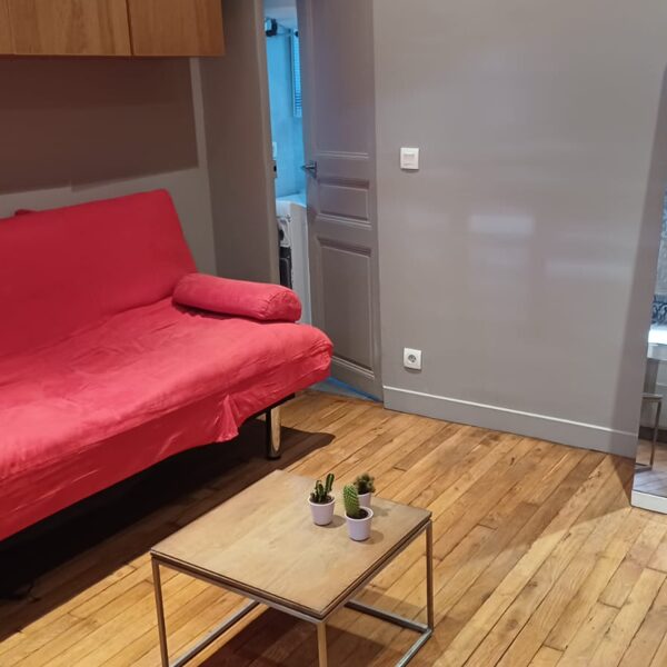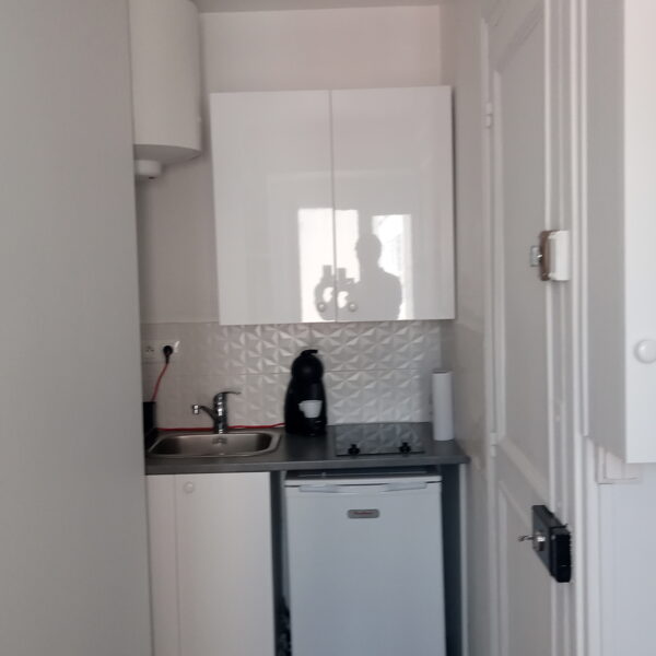 Ce studio de 17m² est situé au 4e étage d'un immeuble des années 1920 au nord de la butte Montmartre. Les priopriétaires souhaitaient optimiser l'espace en vue de mettre le bien en location meublée pour des étudiants ou des jeunes professionnels. Une cuisine entièrement équipée a été créée et séparée du reste de la pièce principale, par une cloison légère qui laisse passer la lumière. Le parquet a été réparé, poncé et vitrifié. Les plafonds et murs ont été repeints. Pour les murs, le choix s'est porté sur un beige clair pour conserver au studio sa luminosité. La rénovation de la salle de bains a constitué un défi. Dans cet espace de 3m2, il a fallu créer une douche, installer des wc, un lavabo, ainsi qu'une lave-linge/sèche linge.