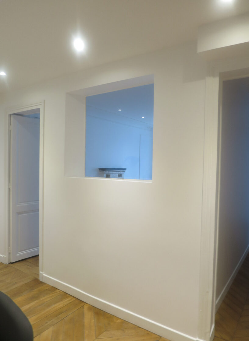 Tο διαμέρισμα 110τ.μ., που βρίσκεται στον πρώτο όροφο ενός κτιρίου σε στιλ Haussmann στην καρδιά του Παρισιού, χρειάστηκε πλήρη ανακαίνιση και αναδιοργάνωση για να στεγάσει ένα δικηγορικό γραφείο. Τα δωμάτια αναδιανεμήθηκαν για τη βελτιστοποίηση του χώρου, ενσωματώνοντας έναν χώρο υποδοχής πελατών και ένα σύστημα κυκλοφορίας που διασφαλίζει την εμπιστευτικότητα των επαγγελματικών συναντήσεων.