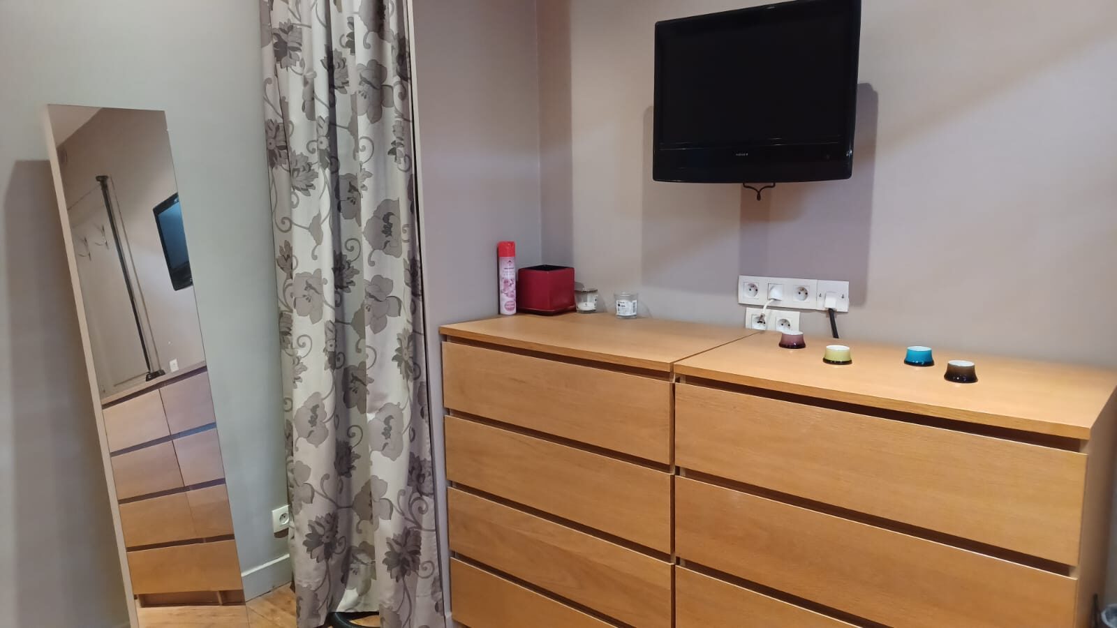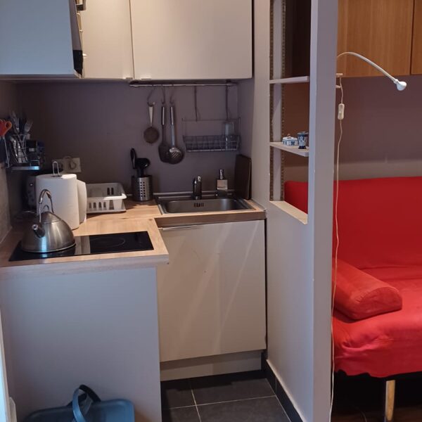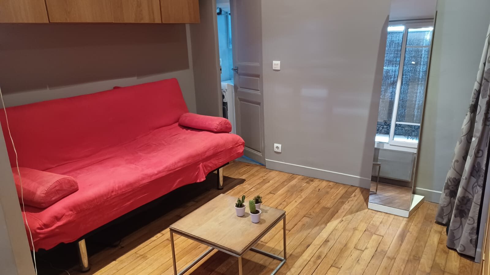 Αυτό το στούντιο 17τ.μ. βρίσκεται στον 4ο όροφο ενός κτιρίου της δεκαετίας του 1920 βόρεια της Μονμάρτρης. Οι ιδιοκτήτες ήθελαν να βελτιστοποιήσουν τον χώρο προκειμένου να νοικιάσουν το ακίνητο επιπλωμένο σε φοιτητές ή νέους επαγγελματίες. Δημιουργήθηκε μια πλήρως εξοπλισμένη κουζίνα, η οποία χωρίστηκε από το υπόλοιπο κυρίως δωμάτιο με ένα ελαφρύ χώρισμα που επιτρέπει τη διέλευση του φωτός. Το παρκέ δάπεδο επισκευάστηκε, τρίφτηκε και βερνικώθηκε. Οι οροφές και οι τοίχοι ξαναβάφτηκαν. Επιλέχθηκε ένα ανοιχτό μπεζ για τους τοίχους, ώστε να διατηρηθεί η φωτεινότητα του στούντιο. Η ανακαίνιση του μπάνιου ήταν μια πρόκληση. Σε αυτόν τον χώρο 3τ.μ., ήταν απαραίτητο να δημιουργηθεί ένα ντους, να εγκατασταθεί μια τουαλέτα, ένας νιπτήρας και ένα πλυντήριο/στεγνωτήριο ρούχων.